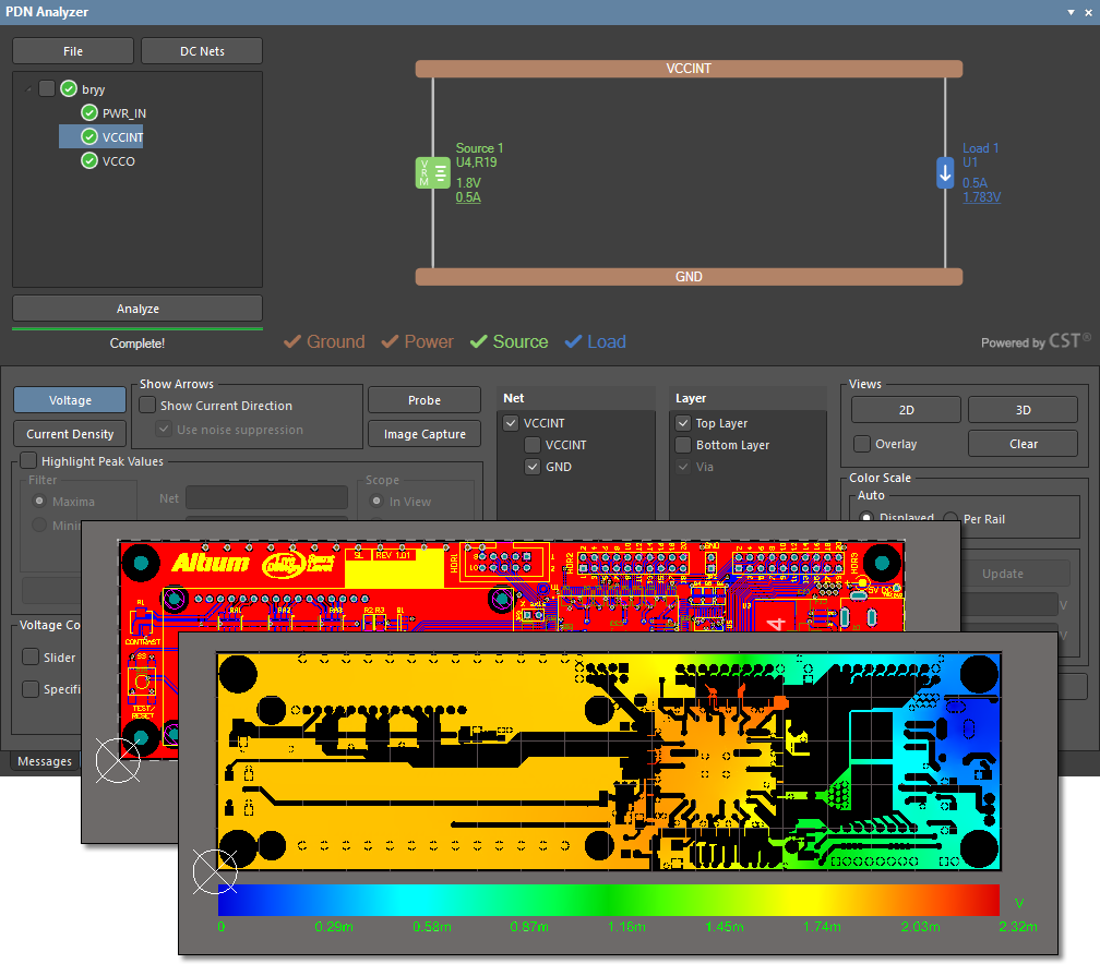 在电力传输和热管理方面,使用电力传输网络分析仪(PDNA)可以确定整个走线,电源和接地层以及过孔的IR损耗。您的PDNA应使用直观的输出格式产生电压和电流密度结果。最好的工具将向您显示交互式彩色地图,使您可以直观地检查您的电路板是否存在潜在的电源热问题和过多的IR压降。
